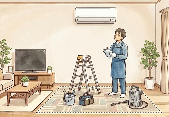 作業には、エアコンの下に「畳1畳分程度のスペース」が必要です。スペースの確保が難しい場合は、事前にご連絡をお願いいたします。