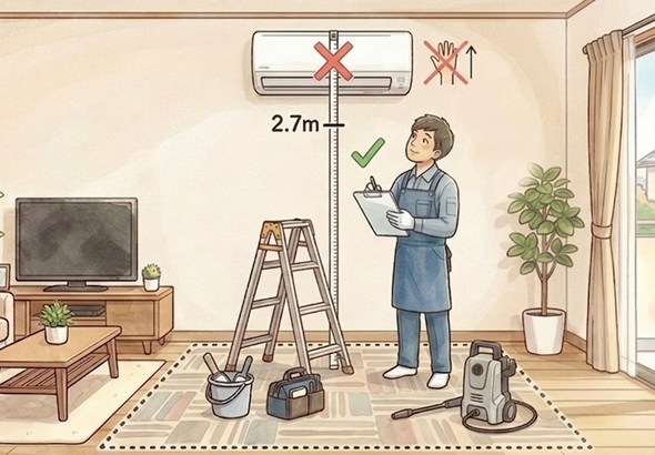 床から2.7m以上(エアコン室内機本体上部)の設置位置の場合は対応不可の場合がございます。