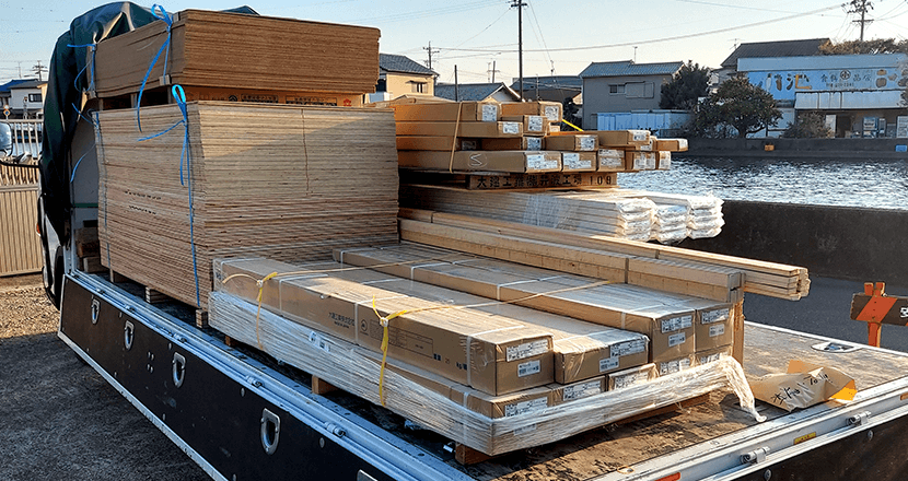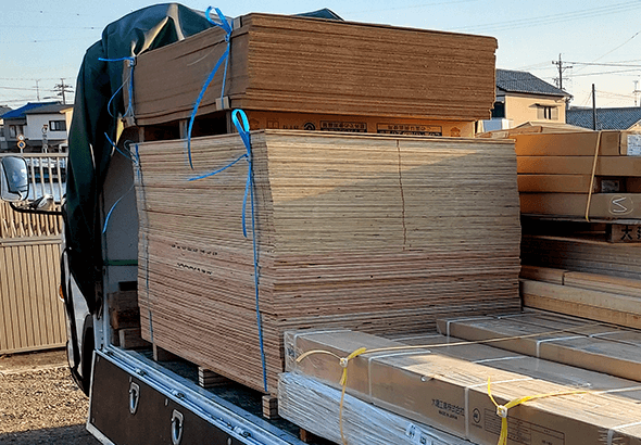 木材の薄い板を、繊維方向が交互に直交するように奇数枚(3枚、5枚など)重ねて接着しています。交互に貼ることで、木材特有の「反り」や「収縮」を抑えどの方向からも均一な強度を持つのが最大の特徴です。