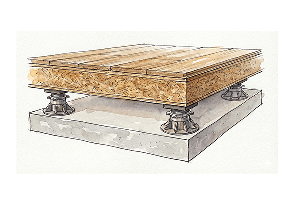 マンションなどの「置き床工法(二重床)」の支持板として非常に一般的です。遮音性が高く、踏み心地を安定させるために使われます。